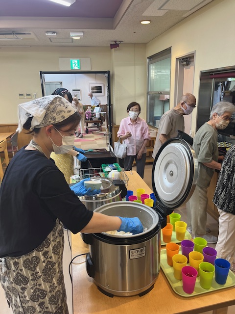 当日は、入居者様が受付や配膳を行い、デイサービスの利用者の方々など、内外のお客様にサービスを行われています。また、法人の事務作業のボランティア活動として、広報誌の封入などをしていただく機会があります。