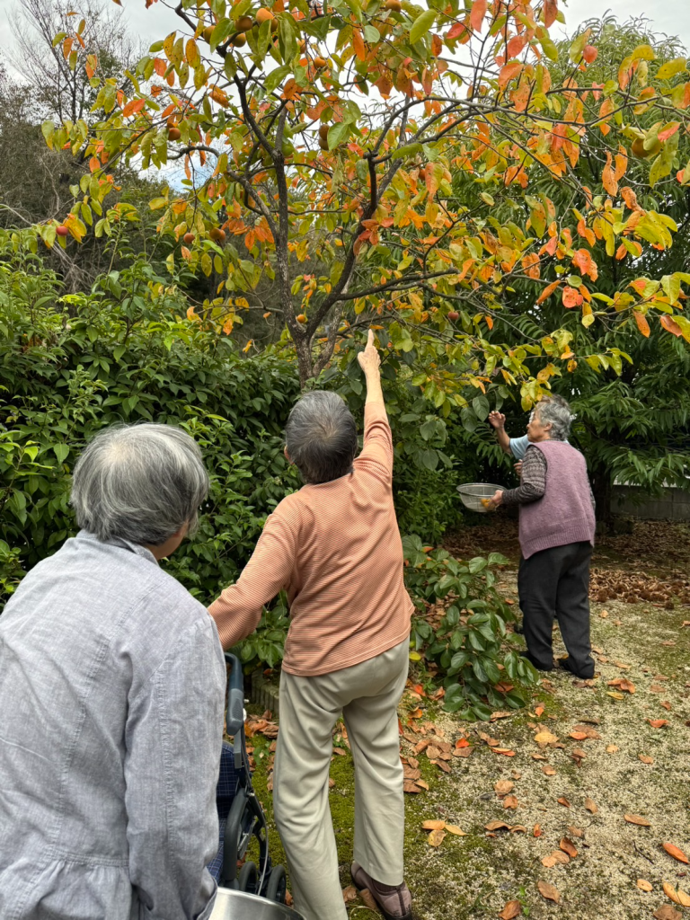 庭の柿が良い色に色づいてきたので、皆さんに声かけをして収穫しました😊