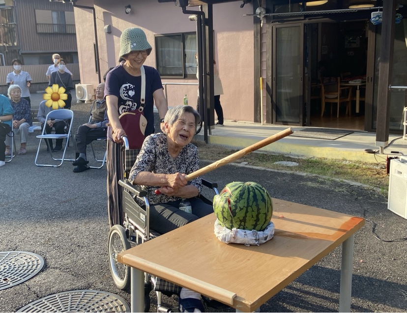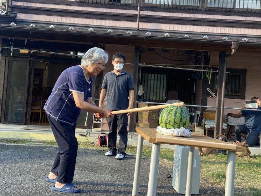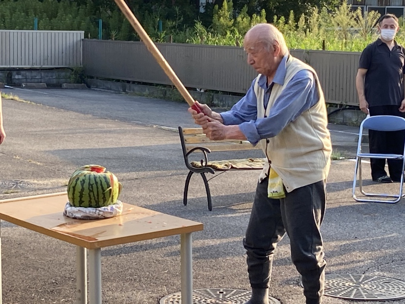 森口理事長・浅野所長のご挨拶に続き、スイカ割りでは大きな歓声と拍手が👏🍉