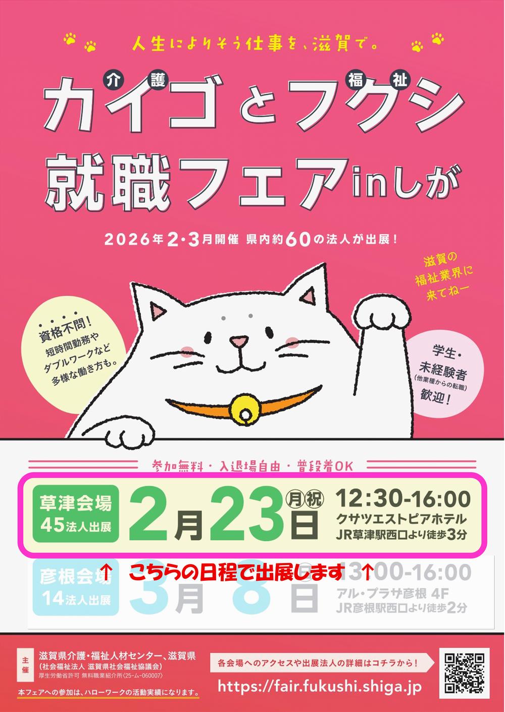 2月23日(月・祝)「カイゴとフクシ就職フェアinしが」に出展します
